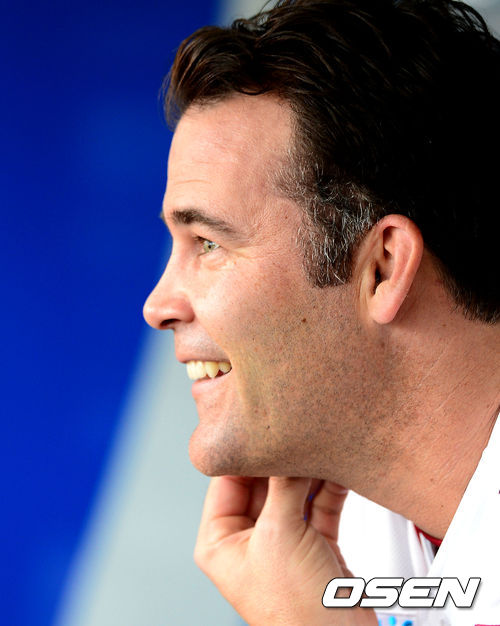 16일 오후 서울 목동야구장에서 열리는 '2013 한국야쿠르트 세븐 프로야구' 넥센 히어로즈와 한화 이글스의 경기,1회초 수비를 무실점을 마친 넥센 선발 나이트가 더그아웃에서 미소를 짓고 있다.