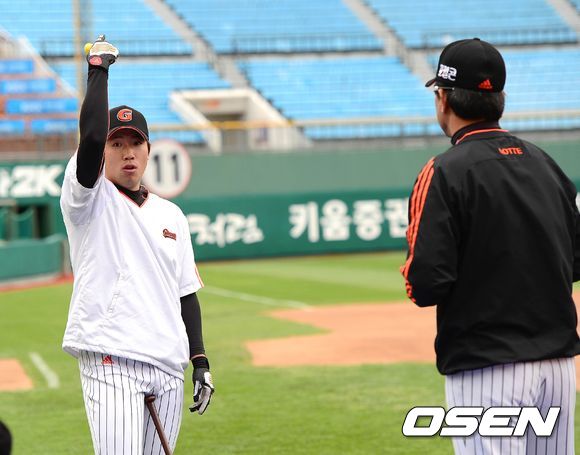 16일 오후 부산 사직구장에서 열리는 '2013 한국야쿠르트 세븐 프로야구' 롯데 자이언츠와 NC 다이노스의 경기에 앞서 롯데 전준우가 15일 경기서 플라이볼 타구에 나온 홈런 세리모니에 대해 김시진 감독 강민호, 박흥식 코치와 이야기를 나누고 있다.