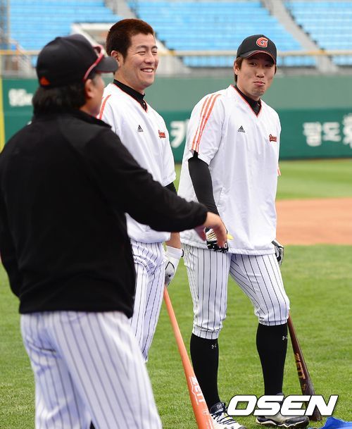 16일 오후 부산 사직구장에서 열리는 '2013 한국야쿠르트 세븐 프로야구' 롯데 자이언츠와 NC 다이노스의 경기에 앞서 롯데 전준우가 15일 경기서 플라이볼 타구에 나온 홈런 세리모니에 대해 김시진 감독 강민호, 박흥식 코치와 이야기를 나누고 있다.