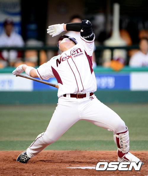 16일 오후 서울 목동야구장에서 열린 '2013 한국야쿠르트 세븐 프로야구' 넥센 히어로즈와 한화 이글스의 경기, 3회말 2사 만루에서 넥센 박병호가 한화 바티스타의 몸쪽 볼에 깜짝 놀라고 있다.