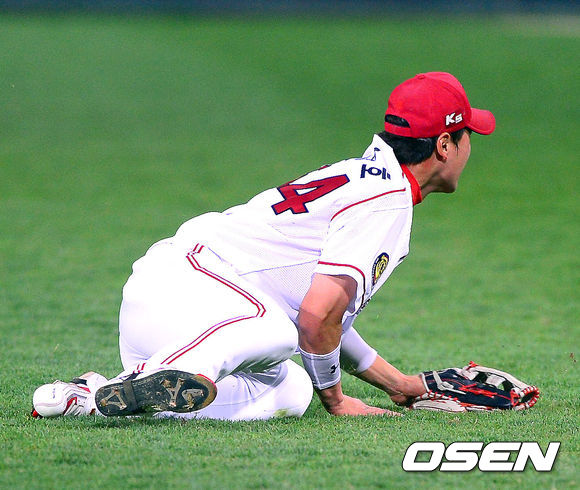 16일 오후 광주 무등구장에서 열린 '2013 한국야쿠르트 세븐 프로야구' KIA 타이거즈와 SK 와이번스의 경기 4회초 1사 SK 박진만의 외야안타때 KIA 이준호 우익수가 타구를 놓치고 있다