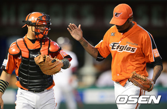 16일 오후 서울 목동야구장에서 열린 '2013 한국야쿠르트 세븐 프로야구' 넥센 히어로즈와 한화 이글스의 경기, 4회말 2사 1,2루에서 한화 바티스타가 넥센 허도환을 삼진으로 처리하고 박노민과 하이파이브를 하며 더그아웃으로 향하고 있다.
