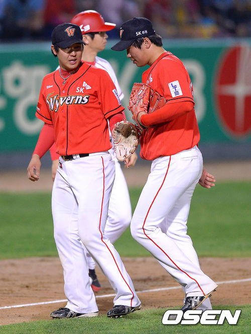 16일 오후 광주 무등구장에서 열린 '2013 한국야쿠르트 세븐 프로야구' KIA 타이거즈와 SK 와이번스의 경기 5회말 이닝 종료 후 SK 최정과 백인식이 이야기를 나누며 더그아웃으로 들어가고 있다
