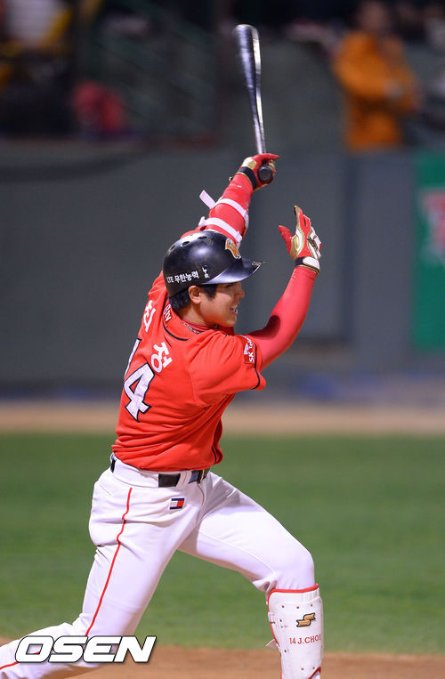 16일 오후 광주 무등구장에서 열린 '2013 한국야쿠르트 세븐 프로야구' KIA 타이거즈와 SK 와이번스의 경기 7회초 1사 2루 SK 최정이 1타점 적시타를 날리고 있다.