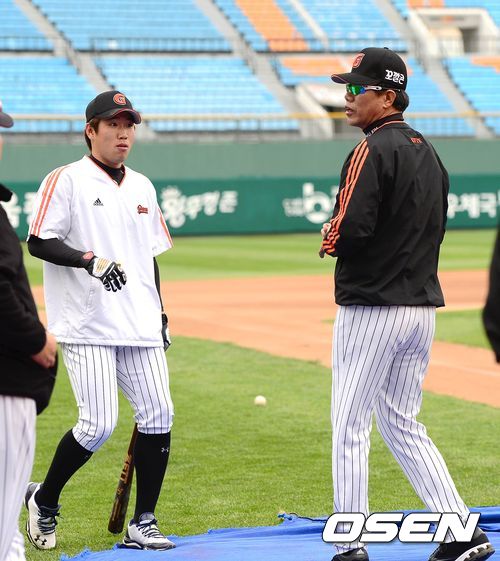 16일 오후 부산 사직구장에서 열리는 '2013 한국야쿠르트 세븐 프로야구' 롯데 자이언츠와 NC 다이노스의 경기에 앞서 롯데 전준우가 15일 경기서 플라이볼 타구에 나온 홈런 세리모니에 대해 김시진 감독 강민호, 박흥식 코치와 이야기를 나누고 있다.