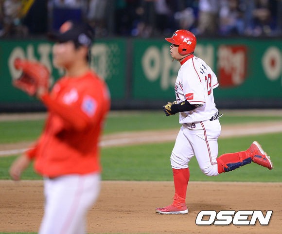 16일 오후 광주 무등구장에서 열린 '2013 한국야쿠르트 세븐 프로야구' KIA 타이거즈와 SK 와이번스의 경기 7회말 무사 1루 KIA 나지완이 2점 홈런을날리고 베이스를 돌고 있다.