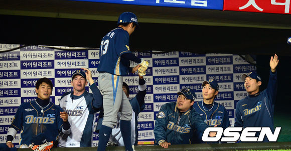 16일 오후 부산 사직구장에서 열린 '2013 한국야쿠르트 세븐 프로야구' 롯데 자이언츠와 NC 다이노스의 경기 7회초 무사 1,2루 NC 조영훈의 적시타로 득점을 올린 최재원이 동료들과 기뻐하고 있다.