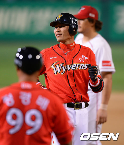 16일 오후 광주 무등구장에서 열린 '2013 한국야쿠르트 세븐 프로야구' KIA 타이거즈와 SK 와이번스의 경기 8회초 2사 1,2루 SK 김상현이 2타점 적시타를 날리고 한곳으로 응시하고 있다.