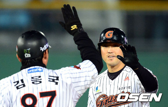 16일 오후 부산 사직구장에서 열린 '2013 한국야쿠르트 세븐 프로야구' 롯데 자이언츠와 NC 다이노스의 경기 7회말 무사 1,2루 롯데 박종윤이 2타점 적시타를 때린 뒤 기뻐하고 있다.
