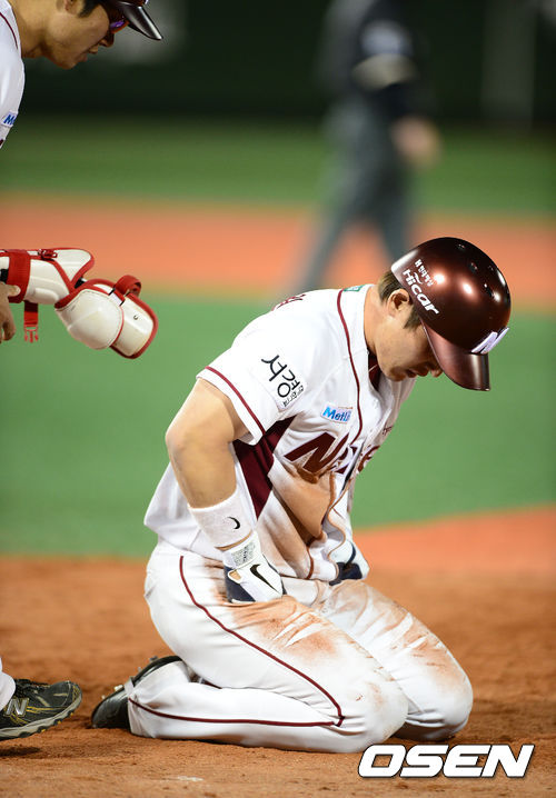 16일 오후 서울 목동야구장에서 열린 '2013 한국야쿠르트 세븐 프로야구' 넥센 히어로즈와 한화 이글스의 경기, 7회말 1사 만루에서 넥센 박동원이 내야땅볼을 날리고 헤드퍼스트 슬라이딩을 했지만 1루에서 아웃되고 있다. 하지만 3루주자 이성열이 홈을 밟으며 동점.