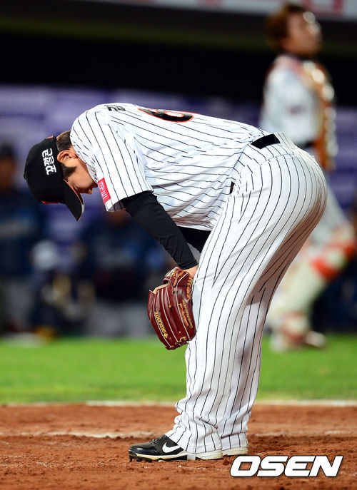 16일 오후 부산 사직구장에서 열린 '2013 한국야쿠르트 세븐 프로야구' 롯데 자이언츠와 NC 다이노스의 경기 9회초 2사 3루 롯데 김성배가 폭투로 점수를 내주자 아쉬워하고 있다.