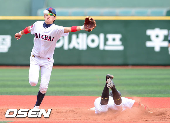 17일 오전 서울 목동구장에서 열린 '제67회 황금사자기 전국 고교야구 대회' 배재고와 광주동성고의 경기 4회말 2사 1루 박고훈의 타석, 포수 최종운의 송구를 김민혁이 받지 못 하고 있다. 1루주자 이태훈은 도루에 성공.