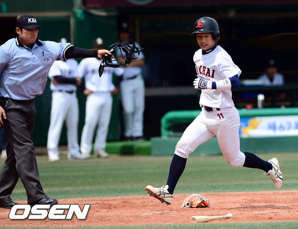 17일 오전 서울 목동구장에서 열린 '제67회 황금사자기 전국 고교야구 대회' 배재고와 광주동성고의 경기 5회초 1사 1,3루 윤현철이 스퀴즈 번트에 3루주자 안형진이 홈을 밟고 있다.
