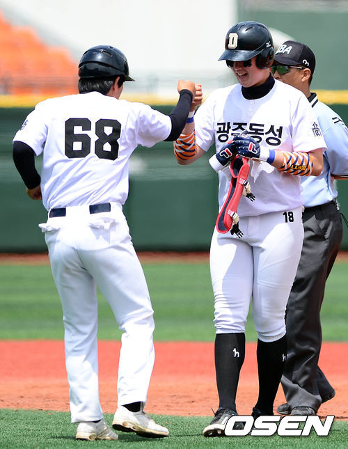 17일 오전 서울 목동구장에서 열린 '제67회 황금사자기 전국 고교야구 대회' 배재고와 광주동성고의 경기 6회말 1사 1,2루 김민혁이 1타점 2루타를 치고 김희상 코치와 하이파이브를 하고 있다.