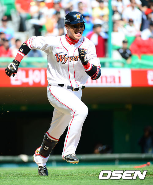 17일 오후 인천 문학구장에서 열린 2013 한국야쿠르트 세븐프로야구 SK 와이번스와 롯데 자이언츠의 경기, 2회말 선두타자 SK 김상현이 우익수 오른쪽 2루타를 날린 후 달려나가고 있다.