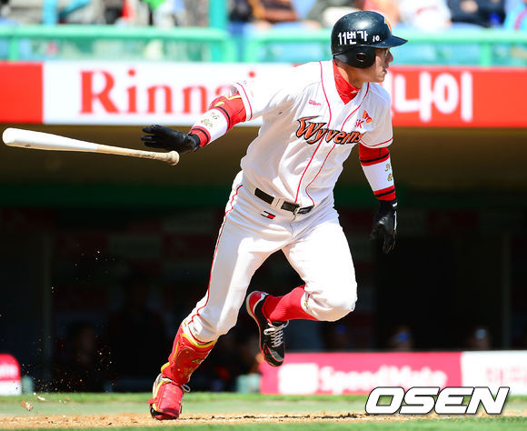 17일 오후 인천 문학구장에서 열린 2013 한국야쿠르트 세븐프로야구 SK 와이번스와 롯데 자이언츠의 경기, 2회말 2사 주자 1,3루 SK 박정권이 좌익수 앞 1타점 선취 적시타를 날리고 있다.