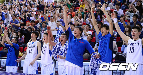 17일 오후 인천 삼산월드체육관에서 열린 '제3회 동아시아 남자농구선수권대회' 한국과 대만의 경기 4쿼터 한국이 득점하자 벤치에 앉아있던 선수들이 환호하고 있다.