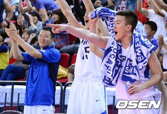17일 오후 인천 삼산월드체육관에서 열린 '제3회 동아시아 남자농구선수권대회' 한국과 대만의 경기 4쿼터 한국이 득점하자 벤치에 앉아있던 박찬희가 환호하고 있다.