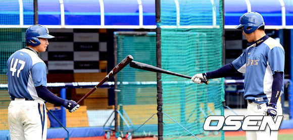 17일 오후 창원 마산구장에서 열리는 NC 다이노스와 삼성 라이온즈의 경기에 앞서 NC 나성범이 모창민과 배트를 가지고 장난을 치고 있다.
