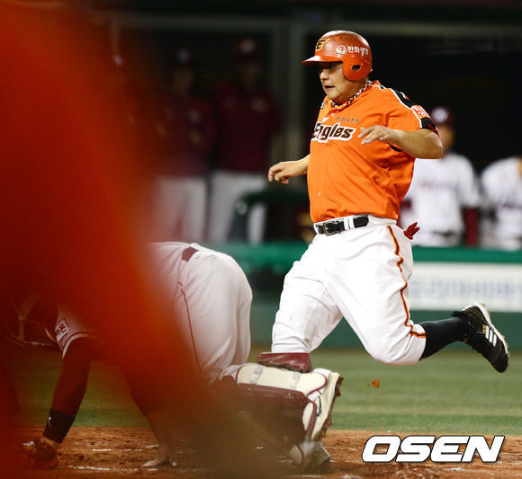 그 틈을 한화 오대석 3루 베이스코치가 놓치지 않았다. 오대석 코치는 2루 지나 3루를 향해 헐레벌떡 뛰어오는 김태균을 멈춰세우지 않았다. 오 코치는 오른팔을 쉼없이 돌렸다. 스피드가 3루에서 어느 정도 죽은 상태였지만, 김태균은 두 다리에 다시 추진력을 넣었다. 3루에서 또 한 번 스피드를 낸 뒤 홈으로 전력질주했다.