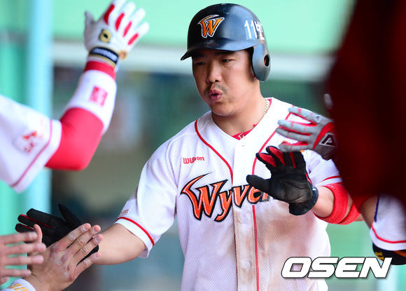 17일 오후 인천 문학구장에서 열린 2013 한국야쿠르트 세븐프로야구 SK 와이번스와 롯데 자이언츠의 경기, 7회말 1사 주자 1,3루 SK 김상현의 1타점 동점타 홈을 밟은 정근우가 덕아웃에서 동료들과 하이파이브를 하고 있다.
