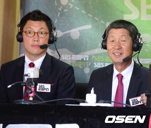 17일 오후 서울 잠실야구장에서 열리는 '2013 한국야쿠르트 세븐 프로야구' LG 트윈스와 KIA 타이거즈의 경기, 경기에 앞서 김성근 고양 원더스 감독과 김정준 SBS ESPN 해설위원이 방송을 준비하고 있다. 한국프로야구 최초의 부자 해설이다. 김성근 감독과 아들 김정준 위원은 SK 와이번스에서 감독과 코치로 세차례 정상을 일구기도 했다.