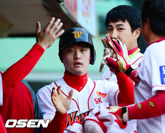 17일 오후 인천 문학구장에서 열린 2013 한국야쿠르트 세븐프로야구 SK 와이번스와 롯데 자이언츠의 경기, 8회말 1사 주자 1,2루 SK 정근우가 좌익수 뒤 1타점 2루타때 홈을 밟은 김성현이 덕아웃에서 하이파이브를 하고 있다.