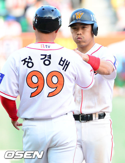 17일 오후 인천 문학구장에서 열린 2013 한국야쿠르트 세븐프로야구 SK 와이번스와 롯데 자이언츠의 경기, 8회말 1사 주자 1,2루 SK 정근우가 좌익수 뒤 1타점 2루타를 날린 후 2루에서 정경배 코치와 하이파이브를 하고 있다.