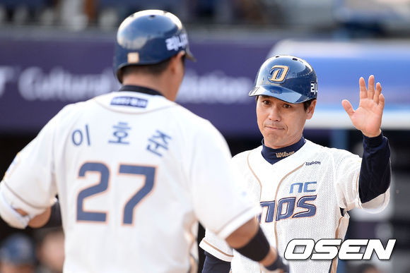 17일 오후 창원 마산구장에서 열린 NC 다이노스와 삼성 라이온즈의 경기, 4회말 무사 NC 전준호 코치가 솔로 홈런을 때린 이호준과 하이파이브를 하고 있다.