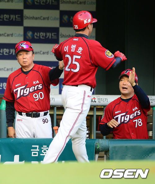17일 오후 서울 잠실야구장에서 열린 '2013 한국야쿠르트 세븐 프로야구' LG 트윈스와 KIA 타이거즈의 경기, 6회초 2사 2,3루에서 KIA 이범호가 선제 스리런 홈런을 날리고 더그아웃에서 선동렬 감독과 이순철 코치와 하이파이브를 하고 있다.