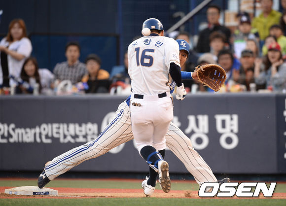 17일 오후 창원 마산구장에서 열린 NC 다이노스와 삼성 라이온즈의 경기, 4회말 무사 NC 모창민이 3루수 앞 내야 땅볼 타구때 1루로 전력 질주하고 있다.