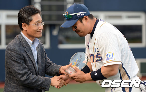 17일 오후 창원 마산구장에서 열린 NC 다이노스와 삼성 라이온즈의 경기, 5회 종료 후 클리닝 타임때 NC 이호준 1500 경기 출장 기념행사에서 KBL 양해영 사무총장이 NC 이호준에게 1500경기 출장기념패를 건네고 있다.