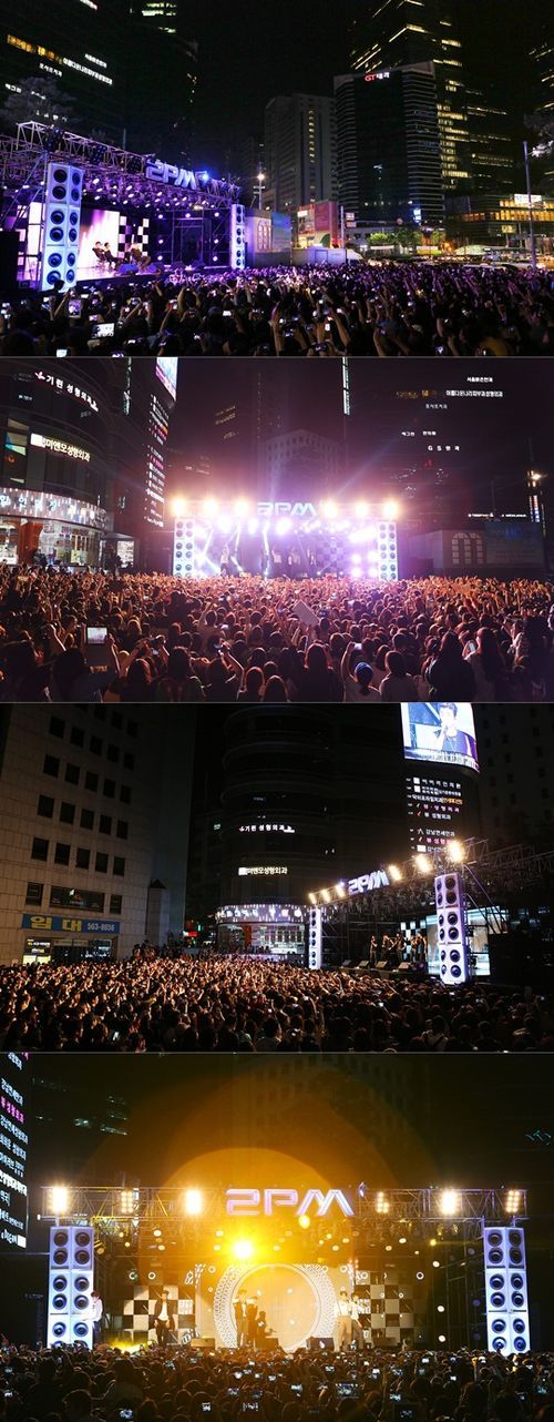 아이돌 그룹 2PM이 서울 강남역 인근에서 미니콘서트를 개최해 수많은 시민들의 호응을 얻어냈다.