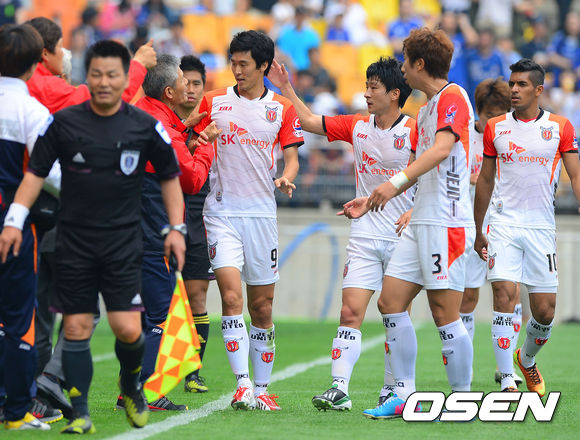 18일 오후 경기 수원월드컵경기장에서 열린 ' 현대오일뱅크 K리그 클래식 2013' 수원 삼성과 제주 유나이티드의 경기, 전반 제주 서동현이 선취골을 넣고 동료들과 기쁨을 나누고 있다