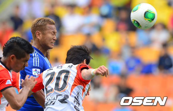 18일 오후 경기 수원월드컵경기장에서 열린 ' 현대오일뱅크 K리그 클래식 2013' 수원 삼성과 제주 유나이티드의 경기, 전반 수원 정대세가 헤딩슛을 시도하고 있다