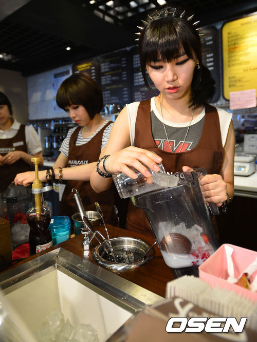 걸그룹 디유닛의 진과 유진이 18일 오후 서울 서교동 망고식스 홍대와우점에서 열린 팬미팅에 참석해 팬들에게 전해줄 음료를 직접 만들고 있다.