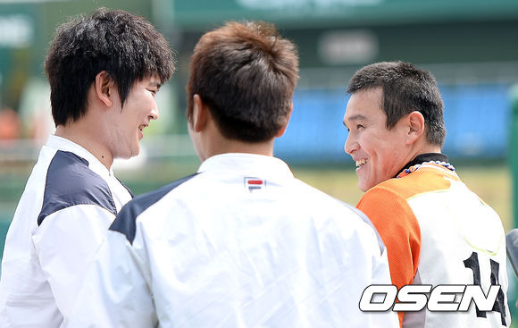 18일 오후 대전구장에서 열리는 '2013 한국야쿠르트 세븐 프로야구' 한화 이글스와 두산 베어스의 경기에 앞서 한화 이대수와 두산 임태훈이 인사를 나누고 있다.