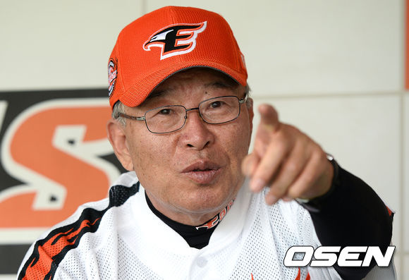 18일 오후 대전구장에서 열리는 '2013 한국야쿠르트 세븐 프로야구' 한화 이글스와 두산 베어스의 경기에 앞서 한화 김응룡 감독이 취재진들과 이야기를 나누고 있다.