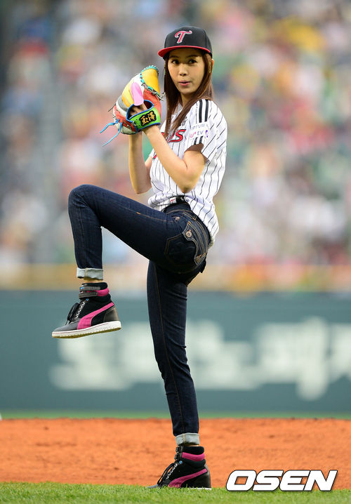 18일 오후 서울 잠실야구장에서 열린 '2013 한국야쿠르트 세븐 프로야구' LG 트윈스와 KIA 타이거즈의 경기, 경기에 앞서 배우 김유미가 시구를 하고 있다.