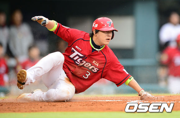 18일 오후 서울 잠실야구장에서 열린 '2013 한국야쿠르트 세븐 프로야구' LG 트윈스와 KIA 타이거즈의 경기, 1회초 1사 2루에서 KIA 김선빈이 김원섭의 선제 1타점 적시타에 홈에서 슬라이딩, 세이프되고 있다.