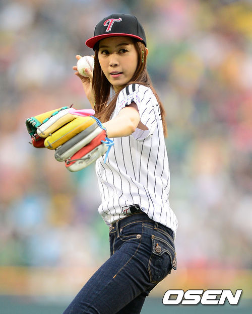 18일 오후 서울 잠실야구장에서 열린 '2013 한국야쿠르트 세븐 프로야구' LG 트윈스와 KIA 타이거즈의 경기, 경기에 앞서 배우 김유미가 시구를 하고 있다.