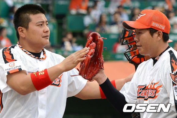 18일 오후 대전구장에서 열린 '2013 한국야쿠르트 세븐 프로야구' 한화 이글스와 두산 베어스의 경기, 한화 김태균이 2회초 이닝을 마치고 더그아웃으로 들어오는 송창현을 격려하고 있다.