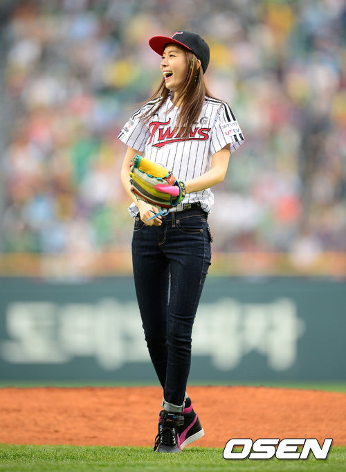 18일 오후 서울 잠실야구장에서 열린 '2013 한국야쿠르트 세븐 프로야구' LG 트윈스와 KIA 타이거즈의 경기, 경기에 앞서 배우 김유미가 시구를 마치고 미소짓고 있다.