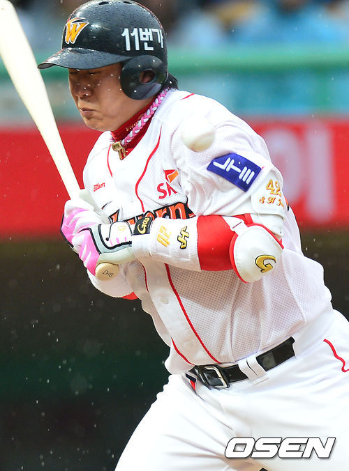 18일 오후 인천 문학경기장에서 '2013 한국야쿠르트 세븐 프로야구' SK 와이번스 대 롯데 자이언츠의 경기가 열렸다. 2회말 SK 공격 1사 1, 2루 상황 9번 정상호가 롯데 선발 옥스프링의 투구에 몸을 맞고 있다.