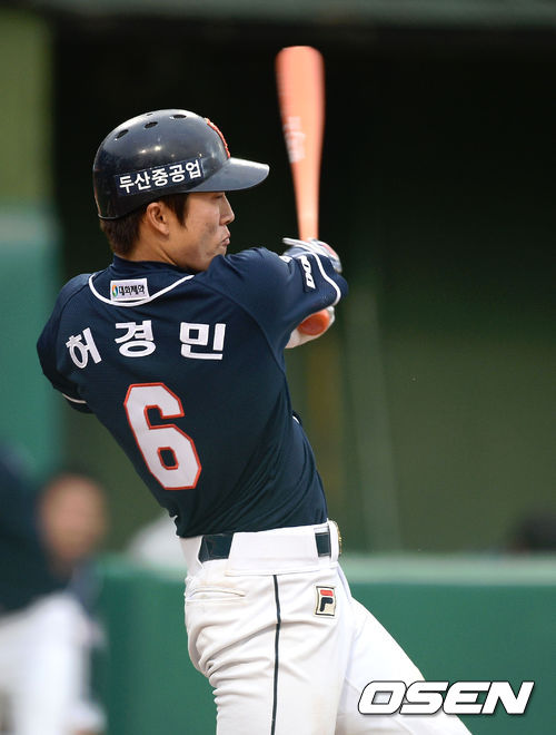 18일 오후 대전구장에서 열린 '2013 한국야쿠르트 세븐 프로야구' 한화 이글스와 두산 베어스의 경기, 4회초 무사 1,2루 두산 허경민이 1타점 적시타를 때리고 있다.