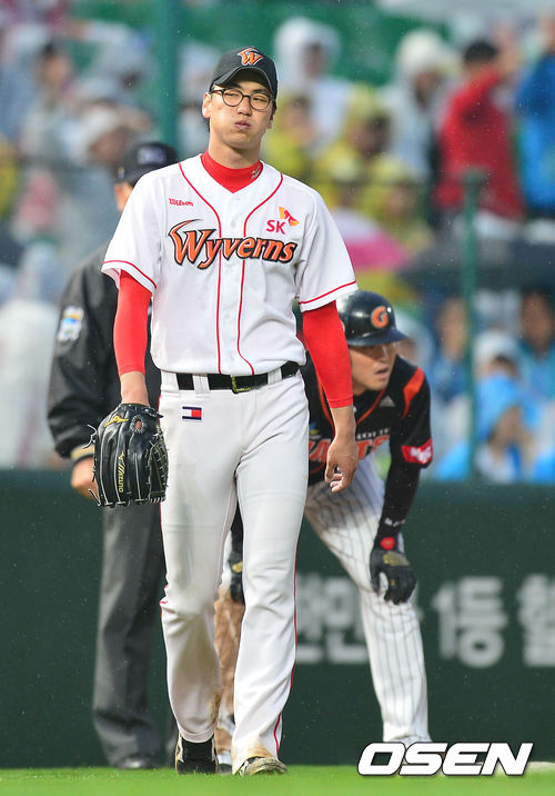 18일 오후 인천 문학경기장에서 '2013 한국야쿠르트 세븐 프로야구' SK 와이번스 대 롯데 자이언츠의 경기가 열렸다. 6회초 롯데 공격 선두타자로 나선 8번 박종윤에게 2루타에 이은 실책으로 3루까지 진루를 허용한 SK 선발 김광현이 아쉬운 표정을 짓고 있다.