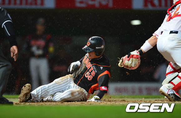 18일 오후 인천 문학경기장에서 '2013 한국야쿠르트 세븐 프로야구' SK 와이번스 대 롯데 자이언츠의 경기가 열렸다. 6회초 롯데 공격 1사 만루 상황 4번 강민호의 희생 플라이때 3루 주자 신본기가 태그업해 세이프 되고 있다.