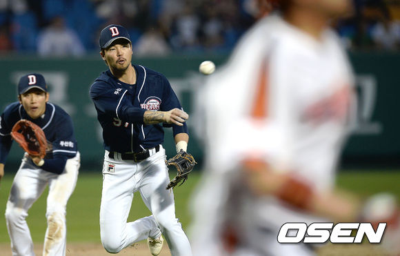 18일 오후 대전구장에서 열린 '2013 한국야쿠르트 세븐 프로야구' 한화 이글스와 두산 베어스의 경기, 6회말 무사 두산 오재원이 한화 김태완의 땅볼 타구를 잡아 1루로 송구하고 있다.