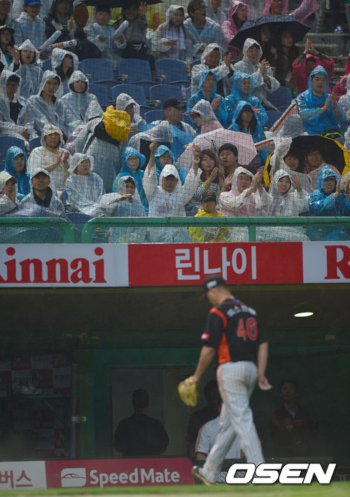 18일 오후 인천 문학경기장에서 '2013 한국야쿠르트 세븐 프로야구' SK 와이번스 대 롯데 자이언츠의 경기가 열렸다. 6회말 SK 공격 선두타자로 나선 8번 박정권에게 안타를 허용한 롯데 선발 옥스프링이 마운드를 내려가며 팬들의 격려를 받고 있다.