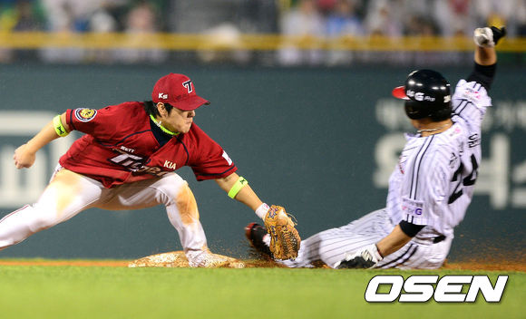 18일 오후 서울 잠실야구장에서 열린 '2013 한국야쿠르트 세븐 프로야구' LG 트윈스와 KIA 타이거즈의 경기, 8회말 2사 1루에서 KIA 김선빈이 2루 도루를 시도한 LG 정의윤을 태그아웃시키고 있다.
